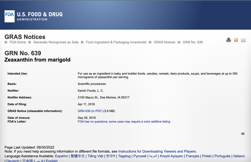 The only U.S. FDA-GRAS officially recognized marigold Zeaxanthin (GRN No. 639), excellent quality and well-documented! See: https://www.cfsanappsexternal.fda.gov/scripts/fdcc/index.cfm?set=GRASNotices&id=639